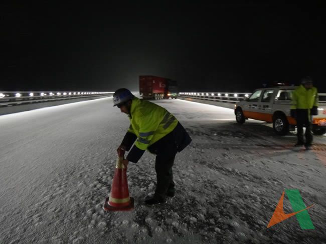 12月8日下午,山東高速膠州灣大橋遭遇入冬以來第一場(chǎng)雪。因氣溫驟降,橋面出現(xiàn)結(jié)冰現(xiàn)象,存在嚴(yán)重的交通安全隱患,公司立即啟動(dòng)特殊路況及交通事故聯(lián)動(dòng)預(yù)案。