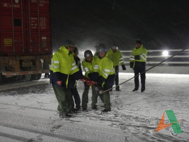 晚上17點(diǎn)30分,一輛車號(hào)為魯RF7696的斯太爾集裝箱車因操作不當(dāng),車輛從行車道側(cè)滑撞向護(hù)欄,車頭被卡在集裝箱和護(hù)欄之間,路政管理人員與交警第一時(shí)間趕赴現(xiàn)場(chǎng)營(yíng)救,并根據(jù)預(yù)案要求迅速進(jìn)行現(xiàn)場(chǎng)布控及現(xiàn)場(chǎng)勘查、取證。盡管因天氣惡劣、風(fēng)雪交加、路面濕滑等原因現(xiàn)場(chǎng)施救難度增加,但在路政和交警的共同努力下,事故車輛于21點(diǎn)30分拖離現(xiàn)場(chǎng)。由于指揮得當(dāng),措施得力,各部門高效協(xié)調(diào)配合,山東高速膠州灣大橋未出現(xiàn)車輛人員滯留及重大交通事故。