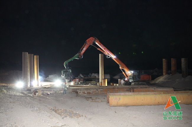 在施工組織方面,加大人員設備投入,施工高峰時參與施工人數達到334人、大型機械設備91臺套;實行24小時兩班倒工作機制,合理規劃多個施工班組平行流水作業,減少交叉窩工和安全隱患;按小時編排施工計劃,每天兩次調度糾偏。在物資供應方面,結合公司現有鋼橋面半成品、護欄和貝雷梁規格尺寸,優化設計方案,大大縮短鋼棧橋拼裝時間,直接從青島、棗莊、濰坊等就近工地抽調現有物資優先支援大橋施工,節省物資準備時間。整個工程投入鋼材總量達1600余噸。