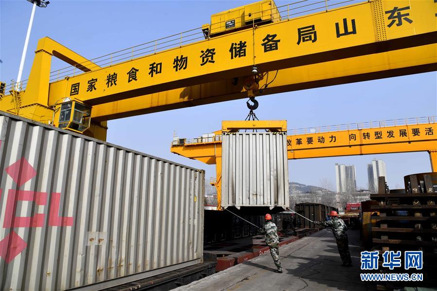 2月21日,在濟南(國儲)鐵路國際站場,工作人員在往歐亞班列上裝運集裝箱。
