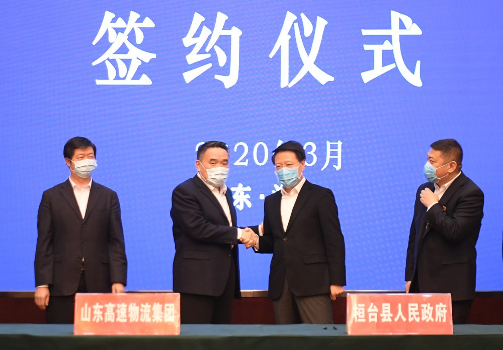 當(dāng)日,山東高速物流集團(tuán)與臨淄區(qū)人民政府、桓臺縣人民政府,山東高速生態(tài)發(fā)展有限公司與博山區(qū)人民政府分別簽署項(xiàng)目合作協(xié)議。